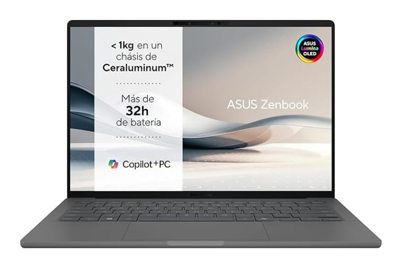| ASUS Zenbook A14 OLED UX3407QA | 980 g | OLED 14″ WUXGA, 400 nits | Snapdragon X1 (8 núcleos) | 16 GB / 1 TB SSD | Hasta 32 h |