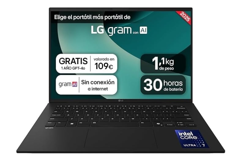 | LG Gram 14 (2025) | 1,12 kg | IPS 14″ WUXGA, antirreflejo | Intel Core Ultra 7 255H | 32 GB / 2 TB SSD | Hasta 30 h |