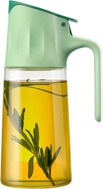 Este modelo evita tocar la tapa al servir gracias a su apertura automática. El vidrio grueso conserva el aceite mejor que el plástico y la boquilla de silicona permite un vertido preciso sin goteos. Ligera y estable, es perfecta para cocinar sin ensuciar la encimera. Su boca ancha facilita rellenarla, incluso desde garrafas grandes. Apta para lavavajillas, con una estética sencilla pero funcional que encaja en cualquier cocina.