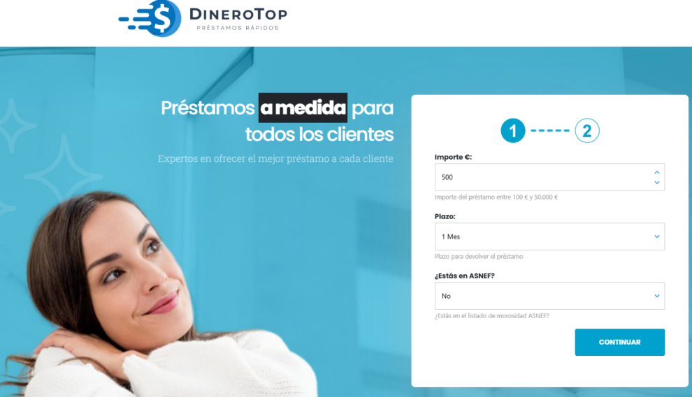 ¿Te han dicho "no" en todas partes y necesitas una solución financiera urgente? DineroTop es una plataforma online especializada en préstamos personales rápidos, incluso para personas en listados de morosidad como ASNEF. Su sistema automatizado busca entre múltiples entidades el préstamo más adecuado según tu situación... y lo aprueba en minutos.