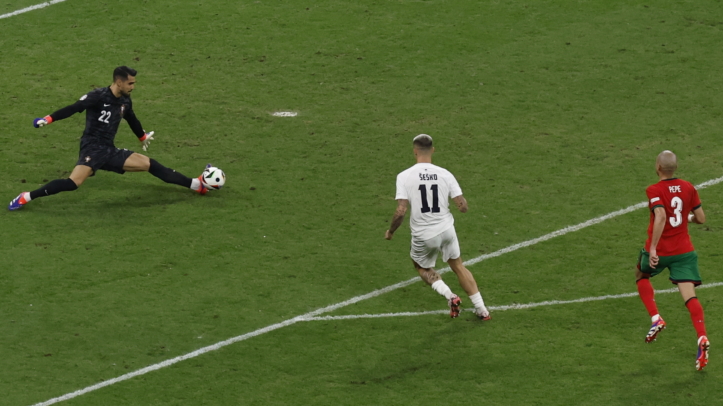 Una salida en tromba de Benjamin Sesko encogió a Portugal. El ariete esloveno ganó un balón en el centro del campo y retó a Pepe en un uno contra uno a campo abierto. Sesko, 20 años más joven que el mítico zaguero, superó al portugués, que hizo lo que pudo para incomodar al delantero, cuyo intento se marchó cruzado.