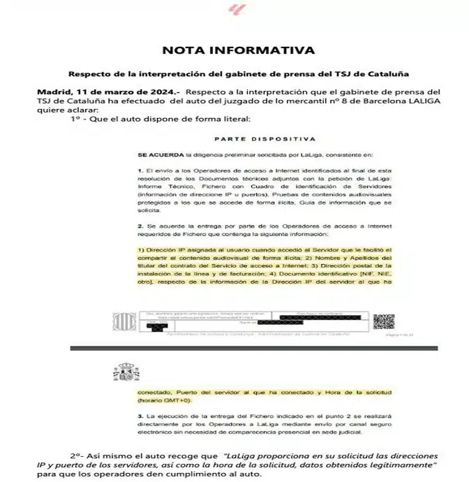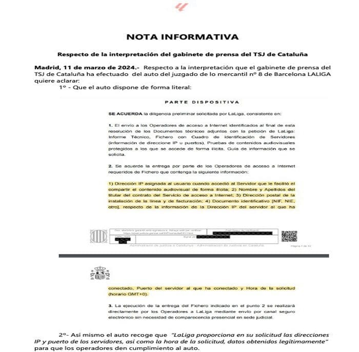 LALIGA ha asegurado que el auto del juzgado de lo mercantil nº 8 de Barcelona obliga a los operadores a identificar a los usuarios que accedan al contenido ilegal que difunden terceros.