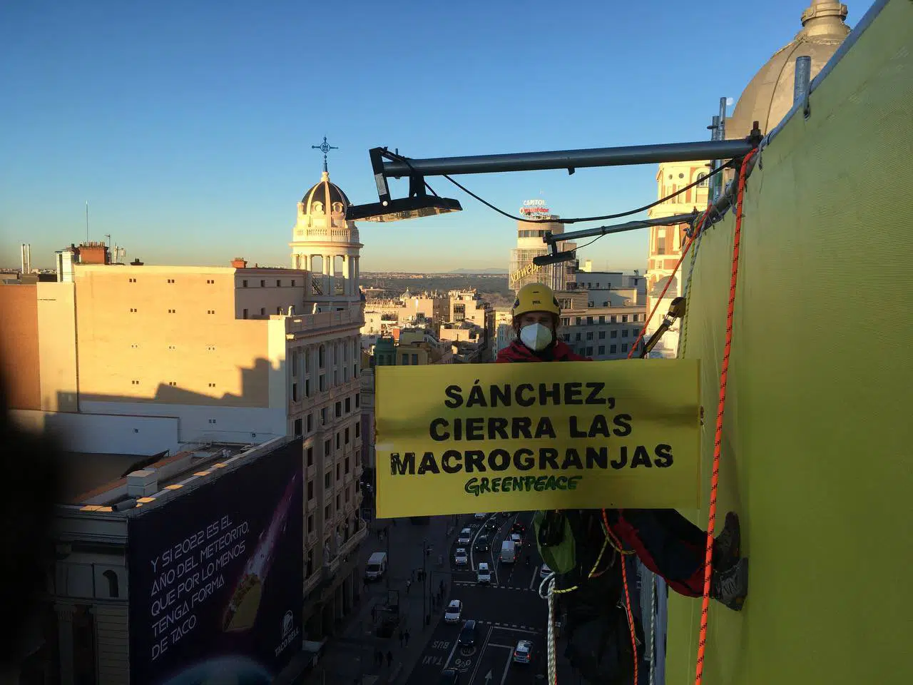 Escaladores de Greenpeace se están descolgando sobre una lona desplegada en los últimos días en la calle de Gran Vía de Madrid que denunciaba el negacionismo de las macrogranjas con el lema 'Las macrogranjas no existen'.