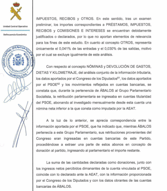 La Guardia Civil escribe que ha detectado al menos 95.437,33 euros de gastos de Ábalos, que provendrían de "ingresos no declarados" y sin rastro bancario. También reconoce que "determinados pagos" a Ábalos y Koldo sí coinciden con los declarados por el PSOE. Pero "dentro de las evidencias examinadas afloran otros pagos en efectivo que habrían sido realizados por el PSOE, sin que conste respaldo documental ni información alguna sobre este particular".
