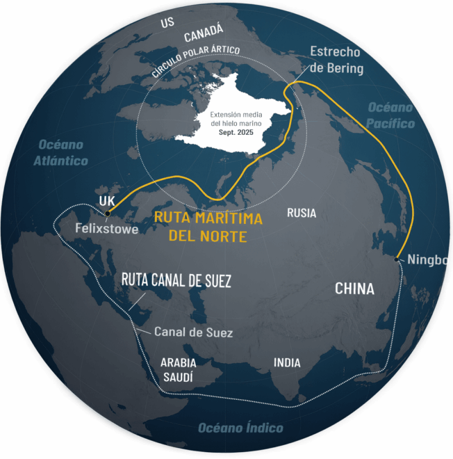 El área de hielo que cubre el océano Ártico fluctúa a lo largo de las estaciones. El hielo se acumula a medida que el agua del mar se congela durante los meses más fríos y se derrite durante los meses más cálidos. Sin embargo, el hielo nunca desaparece por completo en los polos. El mínimo de hielo ártico -que se alcanza todos los años en septiembre- no es en 2025 el más bajo que ha habido, es el tercero según los datos que registran la NASA y la Administración Nacional Oceánica y Atmosférica (NOAA) desde 1978. Si bien la tendencia es, desde que hay registros, claramente decreciente. Un hielo menos extenso y más débil sirve para que los rompehielos dejen abierta la ruta.