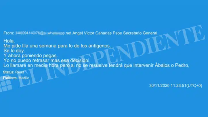 En los meses anteriores, Torres intercambió diversos mensajes con el exescolta navarrp en el que manifestaba su disconformidad con el entonces Ministro de Sanidad, estaba bloqueando la compra de test de antígenos con Megalab. "No hay puta manera con Illa. Le he pedido un jodido mes de pruebas sólo y ni así. Yo no puedo llevar a la ruina a Canarias... Va a hacer que todo Dios vaya contra el Gobierno central", comentó el dirigente canario.