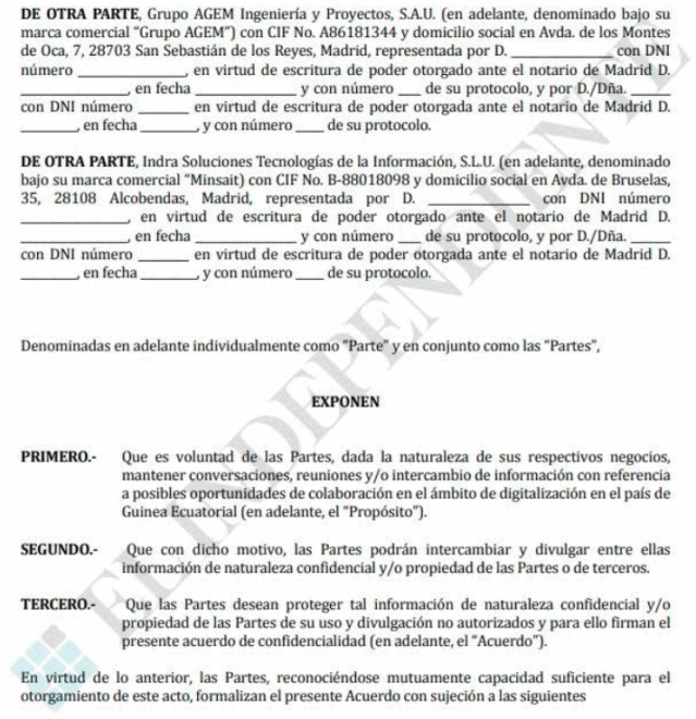 El documento al que ha tenido acceso este periódico es un borrador, enviado entre las partes --como demuestran sus metadatos-- en el que Indra y AGEM muestran su intención de "mantener conversaciones, reuniones y/o intercambio de información con referencia a posibles oportunidades de colaboración" para la digitalización en Guinea Ecuatorial.
