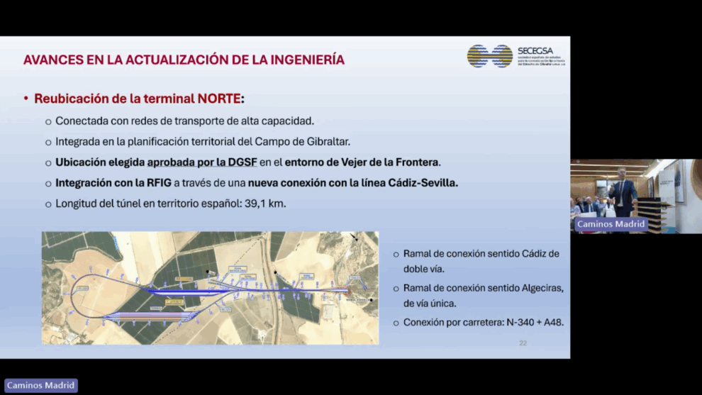 En el lado español, uno de los cambios más relevantes es la reubicación de la terminal norte en el entorno de Vejer de la Frontera. Según los técnicos, esta ubicación permite una mejor integración con la red ferroviaria de alta capacidad, mediante una nueva conexión con la línea Cádiz–Sevilla, con un ramal de doble vía, y un ramal de conexión hacia Algeciras de vía única. El proyecto también contempla la conexión por carretera con la N-340 y la A-48. El cambio de la ubicación reduce las pendientes del trazado y mejora la operatividad tanto para trenes de pasajeros como de mercancías. La longitud total del túnel en territorio español se sitúa en 39,1 kilómetros y el tiempo estimado de cruce entre continentes rondará los treinta minutos.