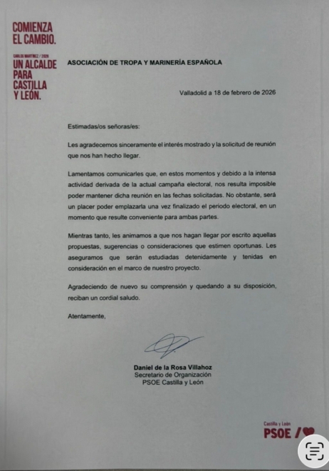 La prueba es una carta oficial de los socialistas fechada el 18 de febrero de 2026, a la que ha tenido acceso El Independiente. En ella, el PSOE de Castilla y León trasladaba a ATME que quedaba “a vuestra disposición” para conocer las inquietudes, "propuestas, sugerencias o consideraciones que estimen oportunas", por parte del colectivo. En esa misma carta los socialistas pedían que esas propuestas fueran enviadas por correo, negando una reunión física hasta después de las elecciones.