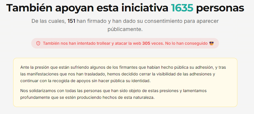 El portal ofrecía íntegramente los nombres de esos firmantes, así como un recuento en directo que ya traspasa los 1.634 personas -a la hora de la publicación-. Tras ello, se ha procedido a mostrar únicamente a los que han dado permiso para ello. Más de 150.