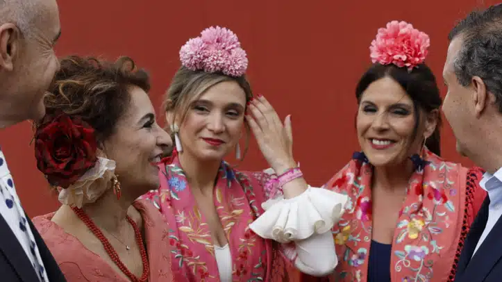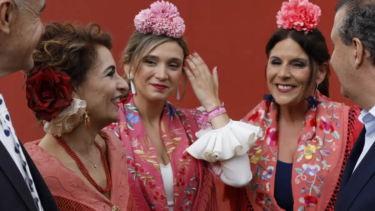 SEVILLA (ESPAÑA), 21/04/2026.- La candidata del PSOE a la Junta, María Jesús Montero (i) junto con vicesecretaria general del PSOE-A y candidata por Huelva al Parlamento andaluz, María Márquez, (c) y la portavoz de la campaña del PSOE en Andalucía Ángeles Férriz (d) visitan la Feria de Abril este martes en Sevilla. EFE/ Julio Muñoz
