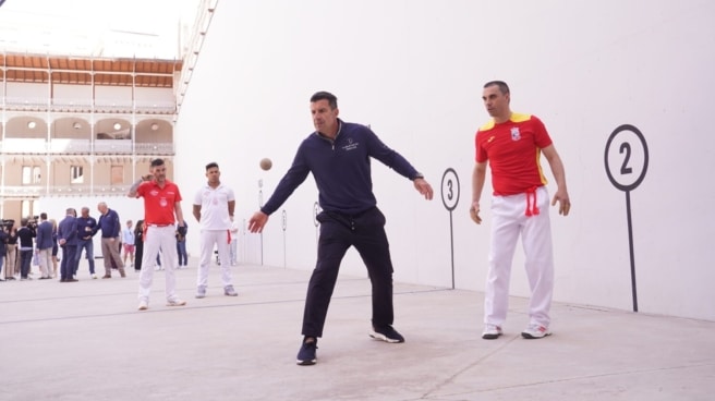 Durante el recorrido por el recinto, los invitados han asistido a una exhibición de pelota vasca a cargo de jugadores de la Federación Madrileña de Pelota. Alguno de ellos, como Figo, se han animado a pelotear.