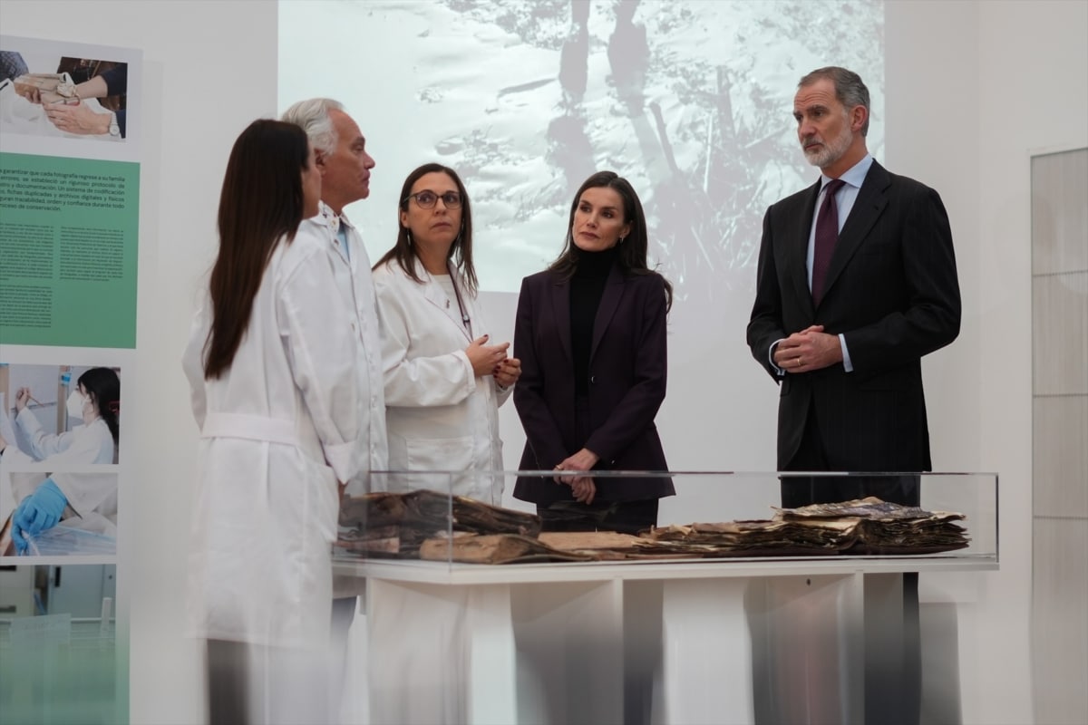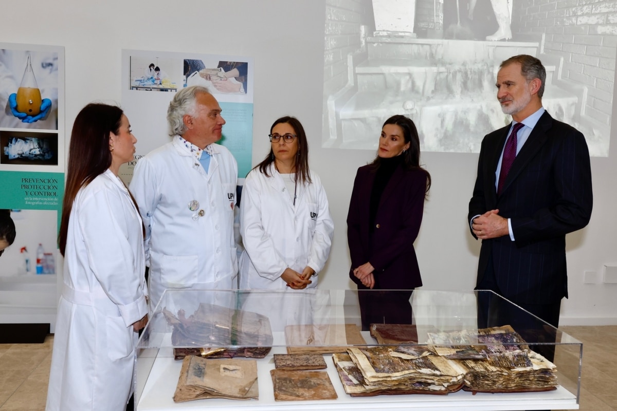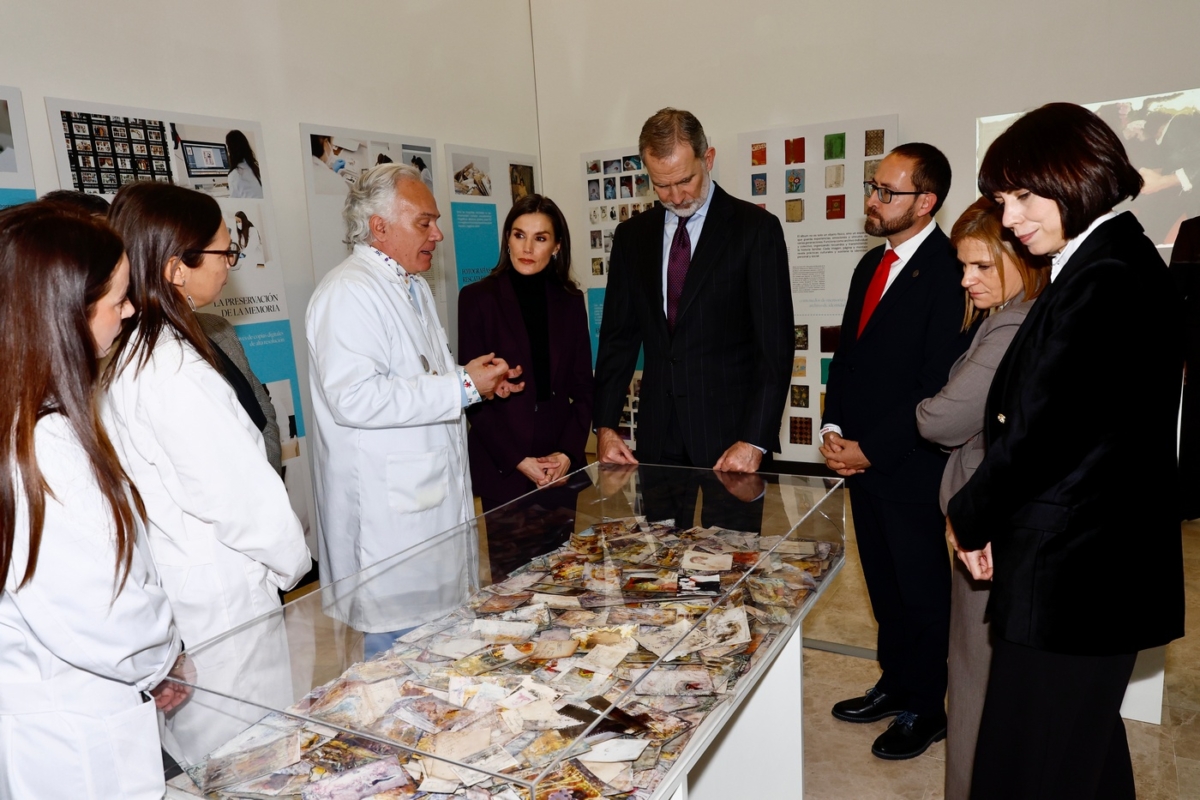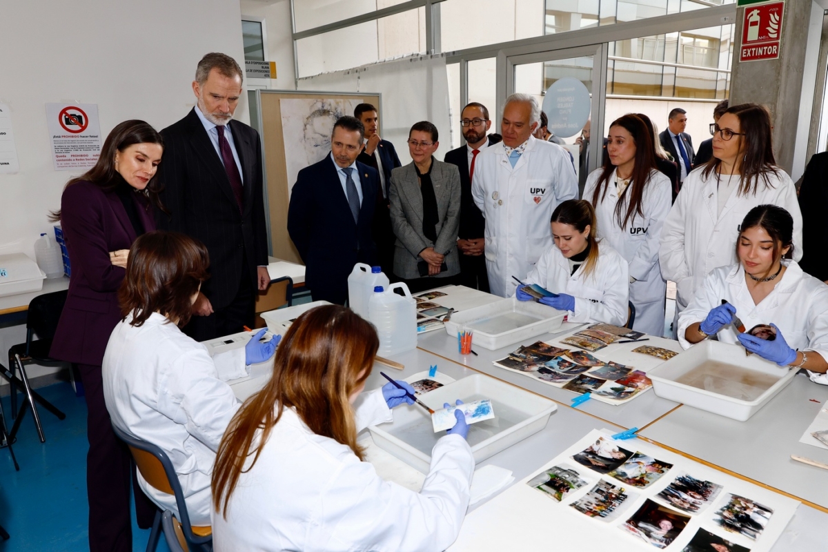 Por la tarde, Don Felipe y doña Letizia han visitado en la Facultad de Bellas Artes de la Universidad Politécnica de Valencia el proyecto Salvem les Fotos UPV / Recuperar las memorias, una iniciativa destinada a salvar el patrimonio fotográfico de las familias afectadas por la dana en la zona de València. El proyecto está dirigido por los investigadores Pedro Vicente-Mullor, Pilar Soriano Sancho y Esther Nebot Díaz, y ha reunido a investigadores, profesionales, estudiantes y voluntarios en una acción colectiva de rescate patrimonial.