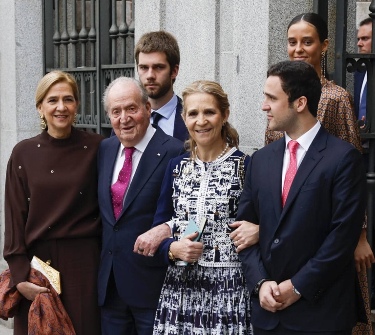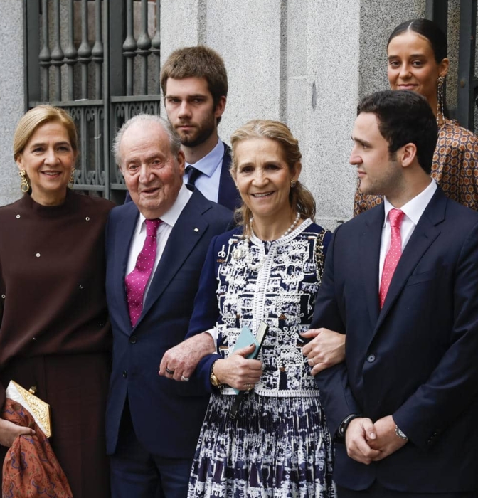 El emérito con sus dos hijas y tres de sus nietos han posado en la puerta de la iglesia mientras la reina Sofía iba solo al banquete, evitando por tanto la instantánea