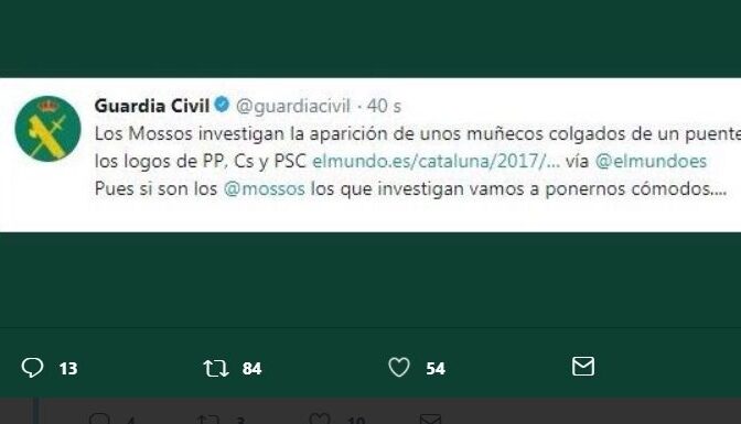 Polémica por un tuit de la Guardia Civil contra los Mossos por el simulacro de asesinato
