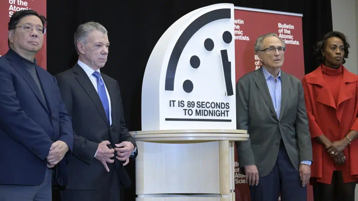 El Boletín de Científicos Atómicos anunció el cambio de un segundo en el reloj (que en los dos pasados años se situó a 90 segundos de la medianoche) bajo el argumento de que el riesgo ha aumentado por la guerra de Ucrania, el conflicto en Oriente Medio y el incremento de arsenal nuclear de las grandes potencias. "Estados Unidos, China y Rusia tienen la responsabilidad primordial de sacar al mundo del abismo. El mundo depende de una acción inmediata", advirtieron en un comunicado.
