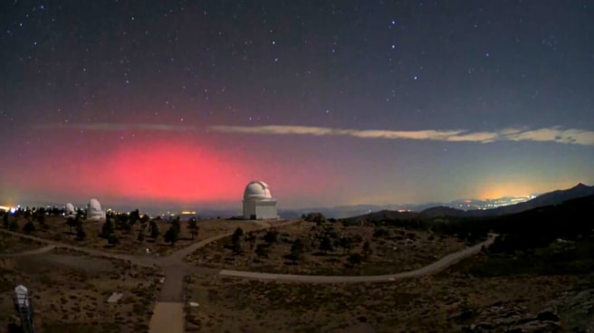 Esta madrugada, el cielo sobre el Observatorio de Calar Alto, en Gérgal (Almería), se ha visto iluminado por una aurora boreal tras el impacto de una intensa tormenta geomagnética provocada por dos eyecciones de masa coronal procedentes del Sol.