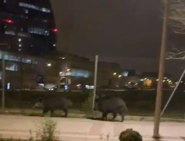 Sorpresa en el barrio madrileño de Las Tablas. Los vecinos observaron anoche a dos jabalíes paseando por una calle de la zona. El vídeo se ha popularizado rápidamente en las redes sociales.