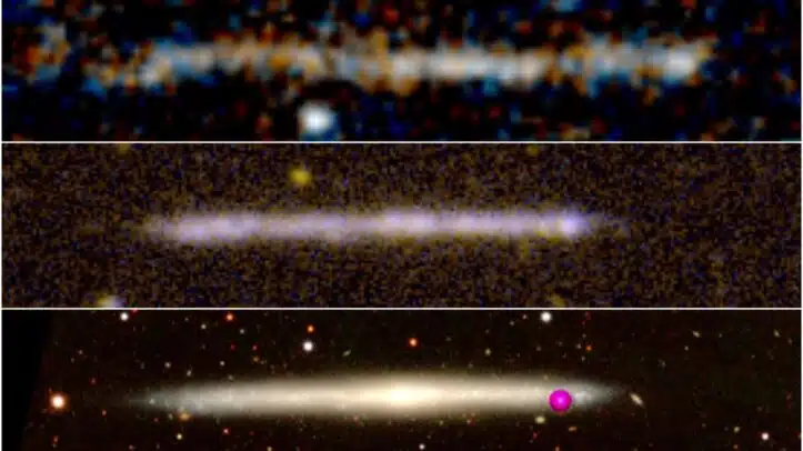 Un estudio realizado por un equipo de investigación del Instituto de Astrofísica de Canarias (IAC) revela que una inusual y delgada estructura de estrellas, descubierta recientemente por el telescopio espacial Hubble, podría tratarse de una galaxia vista de canto. El hallazgo desmonta la interpretación original en donde un agujero negro supermasivo a la fuga habría dejado un rastro de estrellas a su paso. Los resultados se publican en la revista 'Astronomy and Astrophysics Letters'.