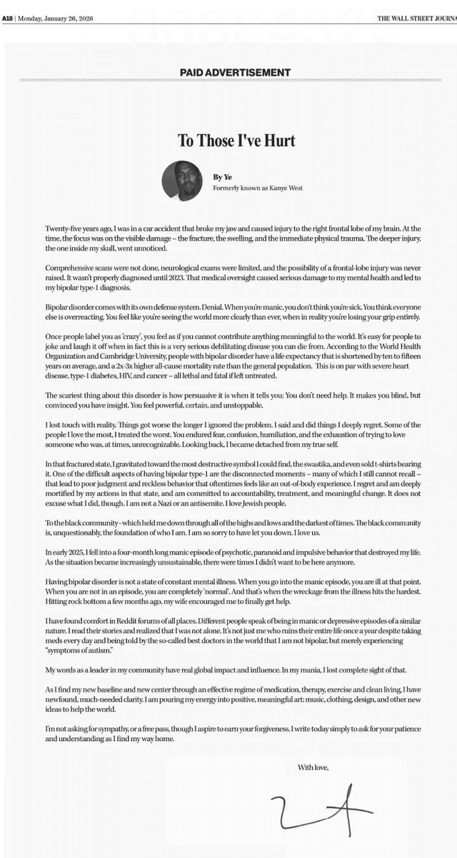Ye ha elegido una página entera de The Wall Street Journal para decir lo que llevaba años esquivando. No una entrevista, no un comunicado en redes, sino un anuncio pagado, titulado A quienes he herido, en el que el rapero estadounidense, antes conocido como Kanye West, ha pedido perdón por sus comentarios antisemitas y por un periodo que describe como “un episodio maníaco de cuatro meses de comportamiento psicótico, paranoide e impulsivo” a comienzos de 2025. “Destruyó mi vida”, ha escrito.