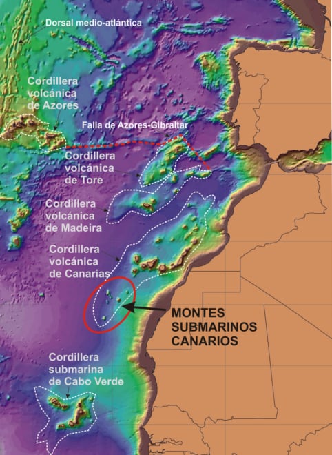 Las Islas Canarias junto a los montes submarinos.