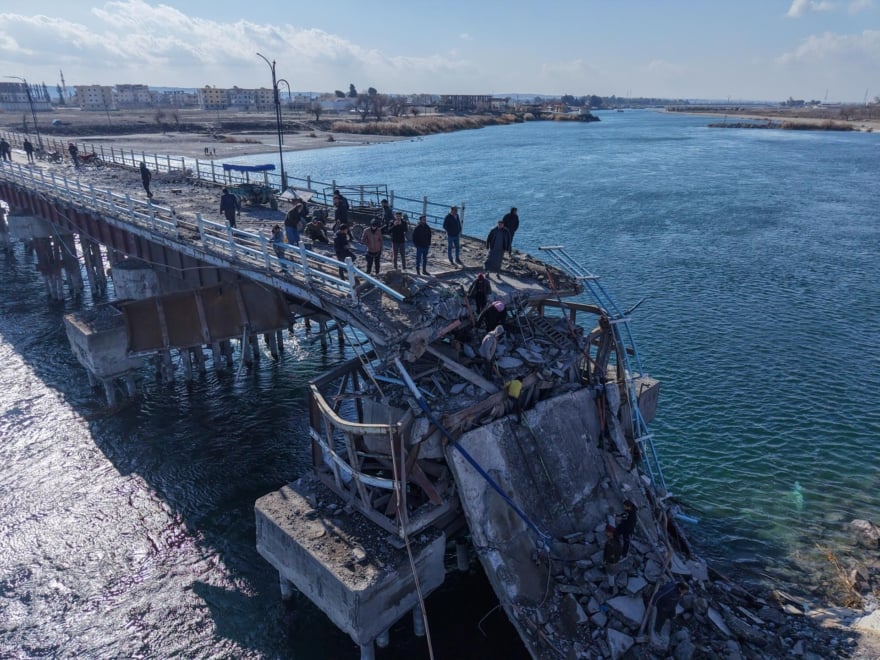 Civiles cruzan un puente derrumbado en Raqqa. | Efe