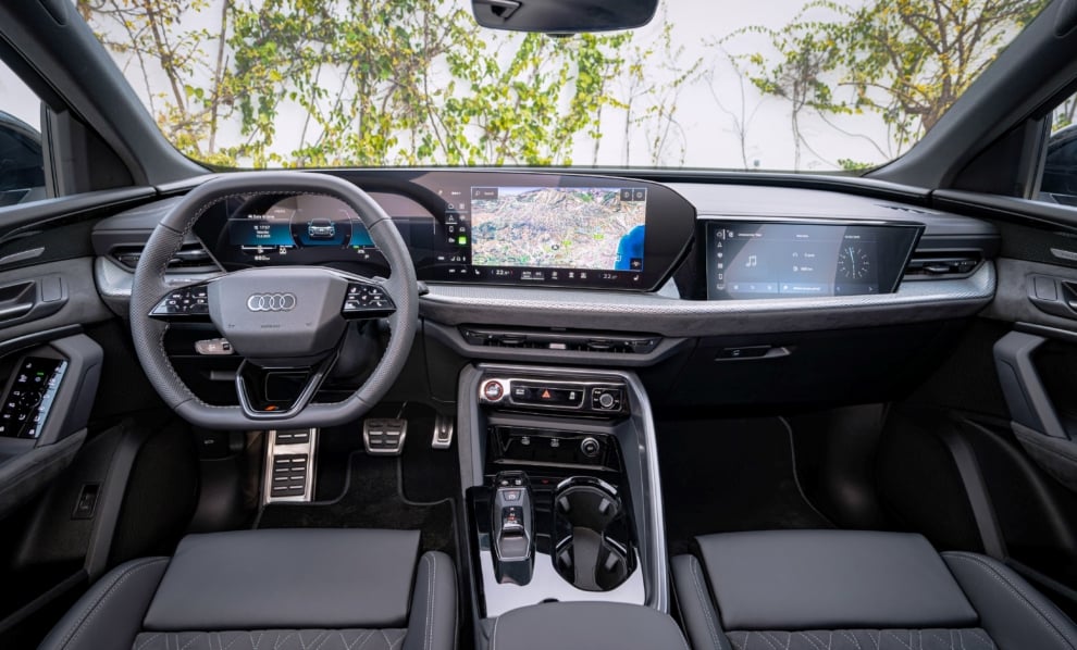 En el interior, frente al conductor, se encuentra la pantalla del cuadro de instrumentos de 11,9 pulgadas (Audi Virtual Cockpit) y a su derecha e integrada en la misma estructura se ubica la pantalla táctil de 14,5 pulgadas del sistema multimedia (MMI). Ambas cuentan con tecnología OLED y ofrecen una magnifica resolución y visualización con cualquier condición de luz ambiental. El manejo de la pantalla multimedia no es que resulte en si mismo complejo, lo que ocurre es que facilita tal cantidad de información que necesita un periodo de adaptación para extraer todo el potencial que encierra. Opcionalmente el acompañante puede disponer de su propia pantalla multimedia, en este caso de 10,9 pulgadas. Esta pantalla cuenta con un modo de privacidad que evita que el conductor se distraiga mientras conduce. Muestra el contenido únicamente al acompañante mientras el conductor solo ve una pantalla negra.