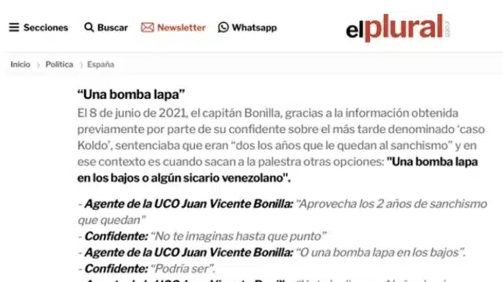 Por eso, Ferraz -¿quién va a ser?- filtró el viernes a El Plural una conversación incompleta entre un excapitán de la UCO, Juan Vicente Bonilla, y un confidente en la que se apreciaba cómo el primero transmitía a su interlocutor su deseo de que una bomba lapa o un sicario venezolano terminaran con el sanchismo. Sin duda, un mensaje que podría demostrar la existencia de una conspiración; de una trama contra el Gobierno; de una cloaca policial, como la que denunciaba Podemos en 2017 y posteriormente Pedro Sánchez, heredero del discurso de Iglesias y quién sabe si, en el futuro, de su vocación por los mass media y la hostelería.