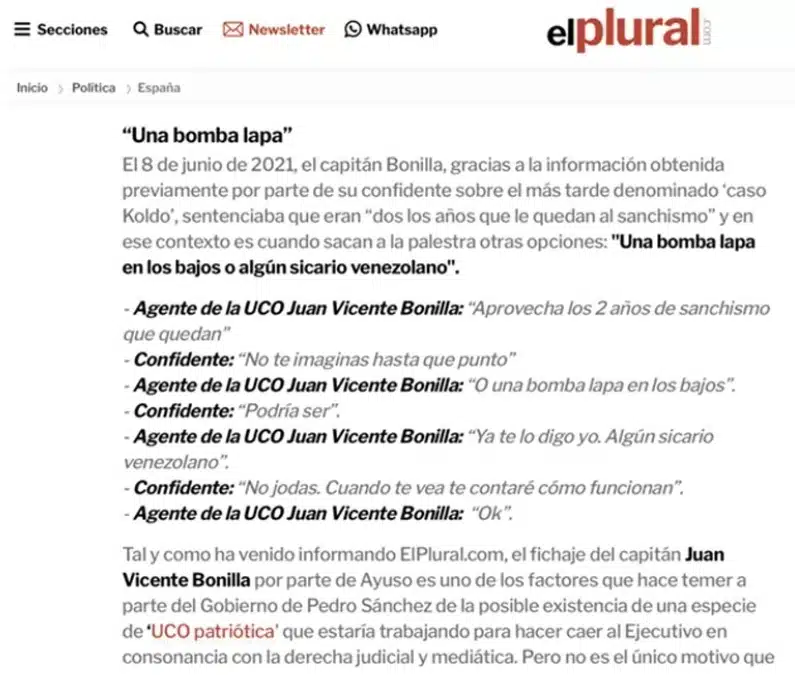 El sábado por la mañana, las periodistas Ketty Garat y Teresa Gómez -The Objective- publicaban una información que ilustraba sobre el bulo que todos ellos se habían comido, dado que su fuente (¿y quién sería su fuente?, ay, ay, ay) había eliminado hábilmente tres frases de la conversación original de WhatsApp para confundir. En la conversación original, el capitán de la UCO expresaba su temor porque le pusieran una bomba lapa en el coche o le enviaran un sicario venezolano por investigar las corruptelas del Gobierno. En la bazofia que difundieron estos medios, se transmitía exactamente lo contrario. LaSexta, de buena ley, rectificó la primera. Después, lo hizo Público.