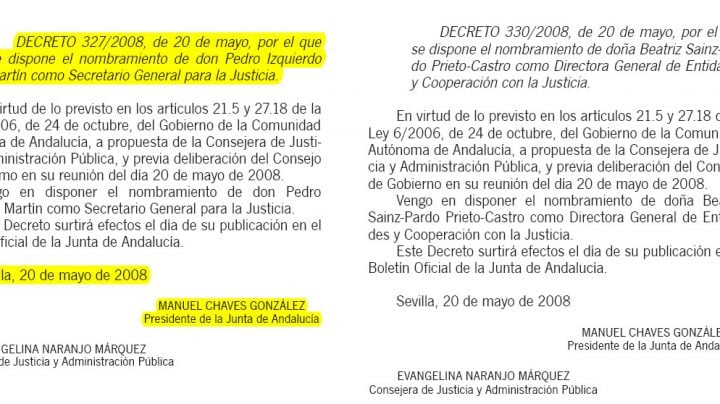Pedro Izquierdo Martín, uno de los tres integrantes de la Sección Primera de la Audiencia de Sevilla junto a María del Pilar Llorente Vara y Encarnación Gómez Caselles, gozó de una excedencia por servicios especiales en la carrera judicial durante más de seis años tras ser nombrado secretario general de Modernización de la Justicia -dependiente de la Consejería de Justicia y Administración Pública- el 29 de abril de 2008 en sustitución de Celso José Fernández Fernández. Entonces presidía la Junta Manuel Chaves, que en las elecciones autonómicas celebradas el 9 de marzo de aquel año había reeditado la mayoría absoluta, y la titular de ese departamento era Evangelina Naranjo.