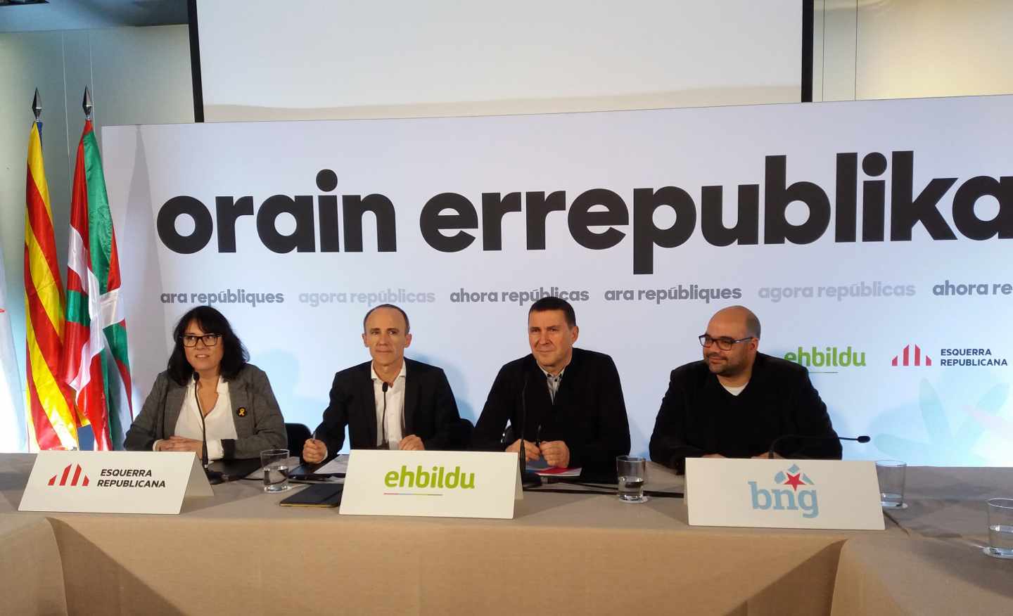 La coalición electoral integrada por EH Bildu, ERC y BNG se ha presentado hoy en el País Vasco como una opción para las elecciones europeas del próximo 26 de mayo conformada por tres fuerzas que "creen en la política de la paz, el diálogo y el acuerdo". En una comparecencia sin preguntas, el dirigente de EH Bildu, Arnaldo Otegi, ha estado acompañado por la mujer de Raúl Romeva, Diana Rivas, así como por responsables del BNG. Durante la misma se ha procedido a la lectura de un comunicado en el que se ha presentado el acuerdo que concurrirá bajo la marca 'Ahora repúblicas' como una opción necesaria ante "la involución democrática" en España y en numerosos estados europeos.