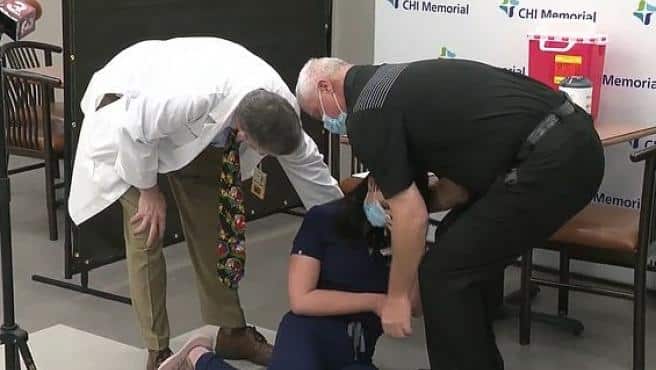 Tiffany Dover, jefa de enfermería del CHI Memorial Hospital de Chattanooga, en Tennessee (EE UU), ha protagonizado un desmayo en directo ante las cámaras de televisión que la entrevistaban tras ponerse la vacuna de Pfizer contra la Covid-19.