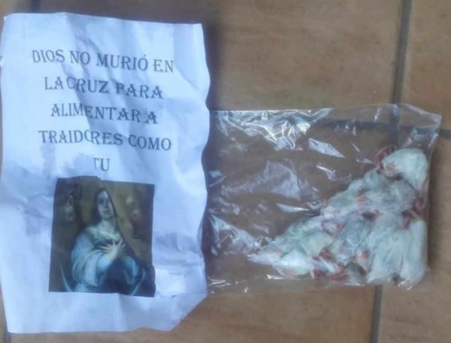 En concreto, se trata de tres bolsas de ratas junto a tres carteles con los siguientes mensajes: 'Dios no murió en la cruz para alimentar a traidores como tú', "España católica, apostólica y romana: fuera ratas protestantes y luteranas" y "Cristo, María Y España. Fuera ratas protestantes y luteranas'.