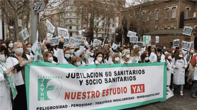 Profesionales sanitarios y sociosanitarios se han manifestado este viernes a las puertas del Ministerio de Inclusión, Seguridad Social y Migraciones para exigir su jubilación anticipada a los 60 años, ya que defienden que su trabajo debe ser considerado una "profesión de riesgo".