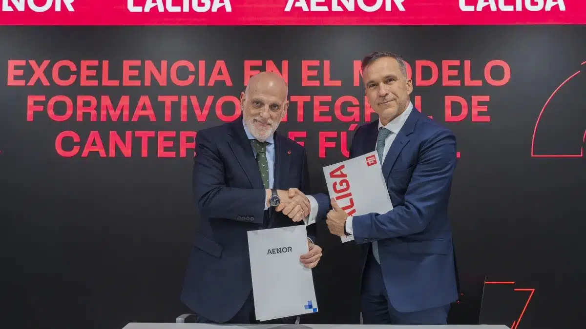 El acuerdo ha sido firmado por el presidente de LALIGA, Javier Tebas, y el CEO de AENOR, Rafael García Meiro, y supone un nuevo paso en la apuesta de LALIGA por “la profesionalización, la mejora continua y la excelencia de las canteras del fútbol profesional español”, según destacaron ambas entidades.