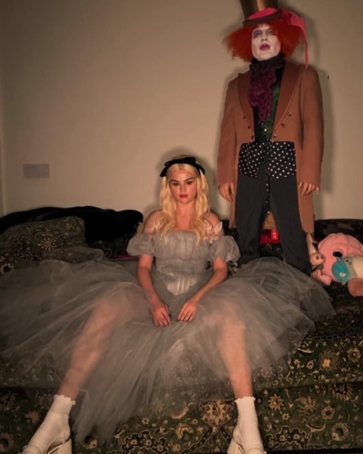 Parejas como Selena Gomez y Benny Blanco, sorprendieron a los fans en Haloween 2024 con con un disfraz conjunto inspirado en Alicia en el País de las Maravillas. Selena se vistió como Alicia con peluca rubia, vestido azul claro de tul estilo off-shoulder, zapatos Mary Jane y un look delicado con maquillaje suave. Y Benny encarnó al Sombrerero Loco (Mad Hatter) con un cabello rizado naranja, maquillaje facial pálido, chaqueta elegante con chaleco y sombrero de copa con detalles llamativos.