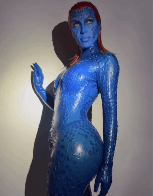 Kim es conocida por sus disfraces glamorosos y muy cuidados. Nos ha sorprendido luciendo como Cher, en varias versiones de Barbie junto a sus hermanas e incluso, en un atuendo muy bien llevado, resaltando su excéntrica personalidad y sus curvas, como Mystique la villana azul de X-Men.