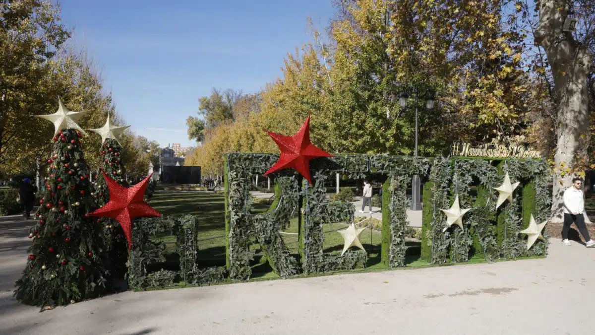 La propuesta se completa con otros elementos ornamentales repartidos en torno al rótulo principal. En los extremos se han colocado árboles de Navidad y estrellas tridimensionales que refuerzan la estética festiva del conjunto y enriquecen la composición visual del espacio. Todo ello convierte el paseo de México en un punto de encuentro especialmente atractivo durante las próximas semanas, tanto para quienes pasean a diario por El Retiro como para quienes se acercan al parque de forma puntual para disfrutar de la Navidad en Madrid.