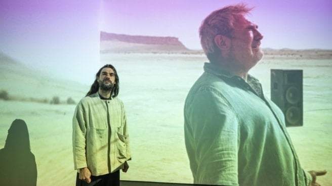 Aunque bebe directamente del universo de la película, el cineasta ha insistido en que se trata de una obra “completamente independiente”. El recorrido arranca con una estructura de altavoces que remite a las raves y prepara al cuerpo antes de acceder a la sala principal, donde tres proyecciones muestran paisajes desérticos y cuerpos en movimiento. En una de ellas aparecen actores de Sirat bailando bajo el sol, entre ellos Sergi López; en otras, mezquitas y templos zoroástricos iraníes que conectan lo ritual con lo contemporáneo.