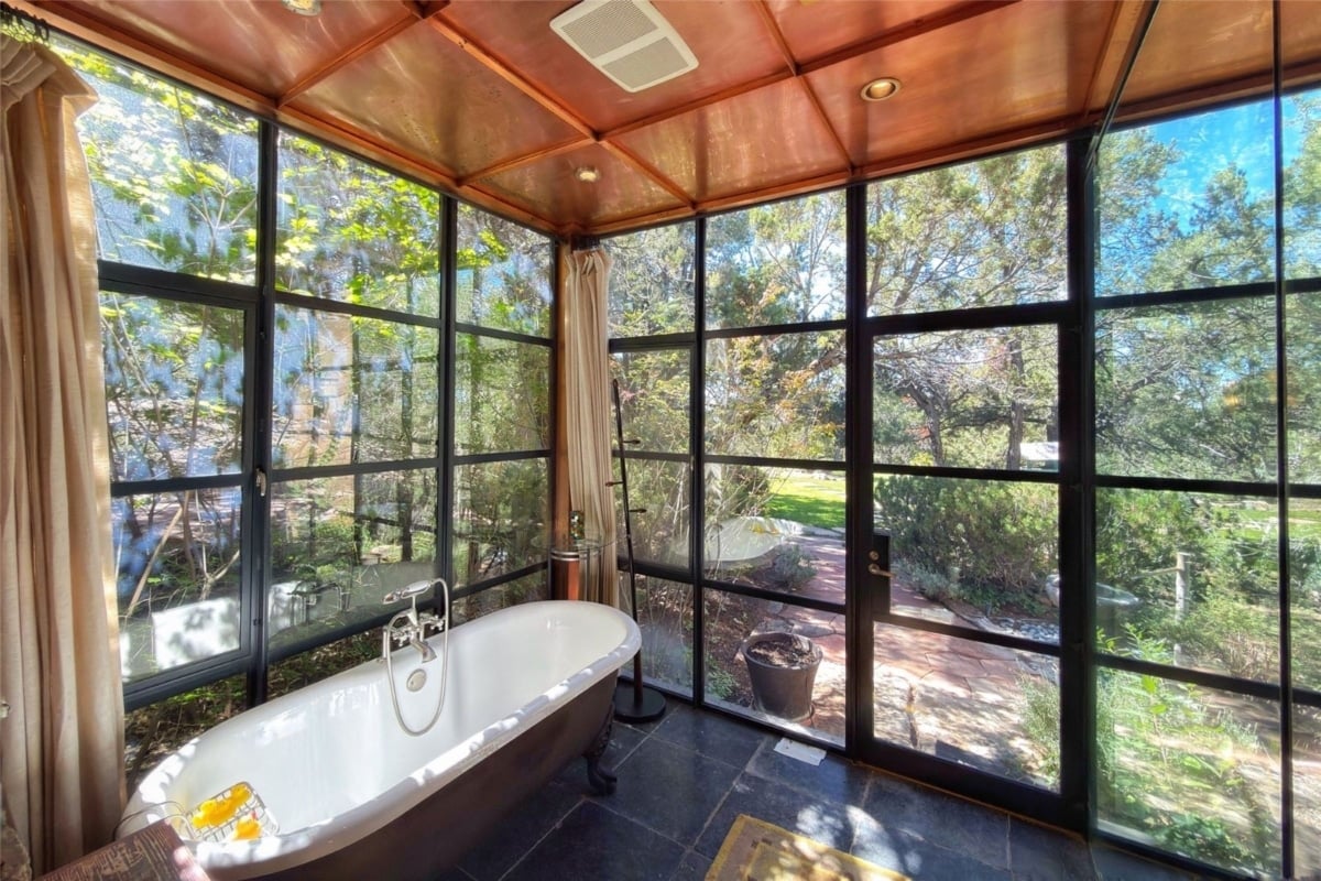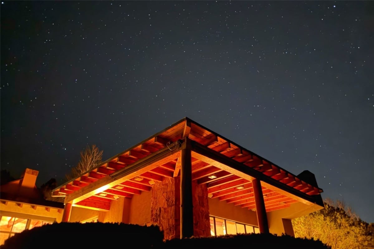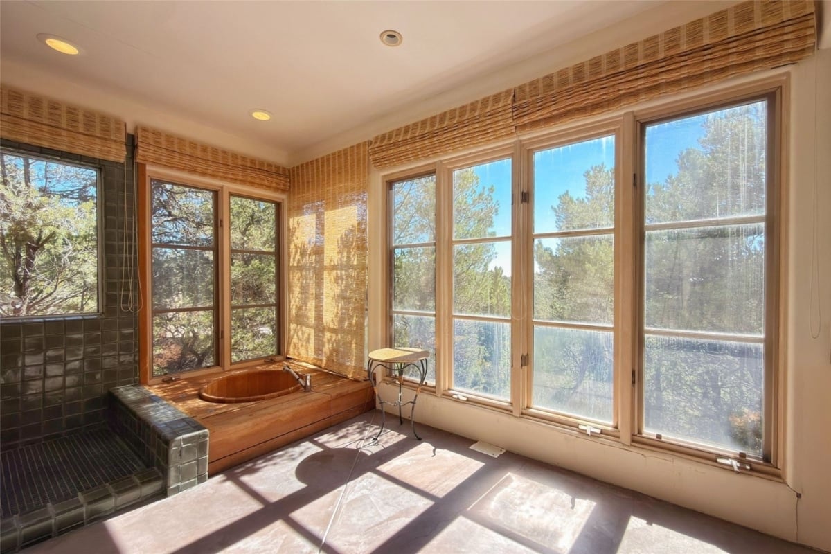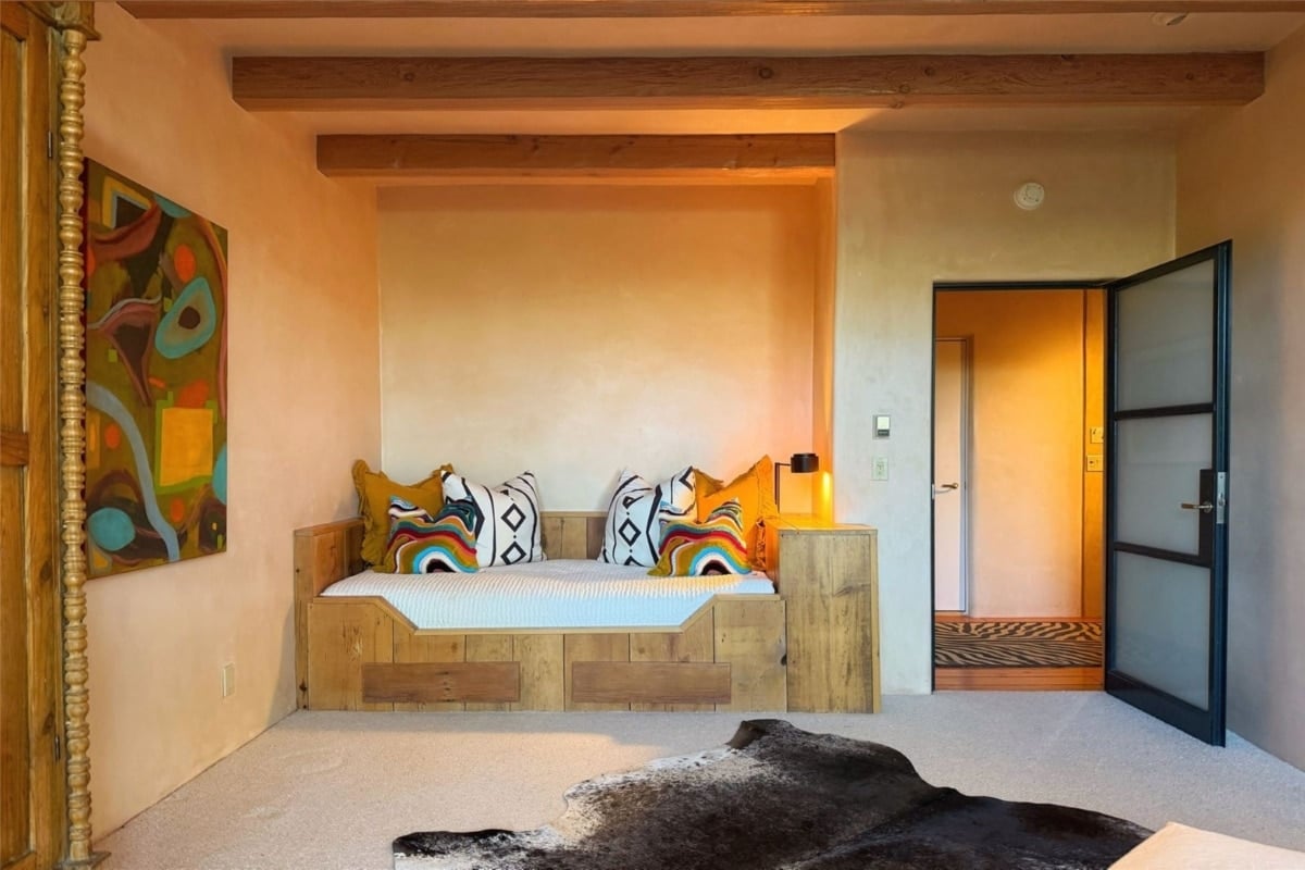 El complejo, que combina aislamiento y accesibilidad –el centro histórico de Santa Fe se encuentra a unos 15 minutos en coche–, cuenta con seis dormitorios, repartidos entre la vivienda principal y una casa de invitados independiente, además de un estudio artístico. La residencia principal, levantada hacia 1997 tras la compra del terreno en los años 90, se aparta del adobe tradicional de la zona y adopta un lenguaje contemporáneo basado en el vidrio, la piedra y el acero, sin prescindir completamente de los guiños a la arquitectura vernácula, con paredes encaladas en tonos tierra e imponentes techos y vigas de madera. Los grandes ventanales de suelo a techo ayudan a integrar el interior con el entorno y articulan los espacios comunes: un amplio salón, una biblioteca con techo textil diseñado para mejorar la acústica donde Hackman solía ver películas y un comedor prácticamente cerrado por cristal.