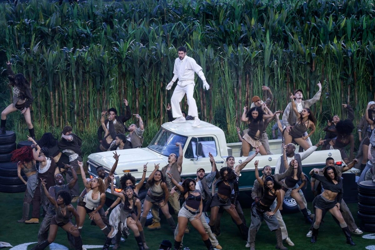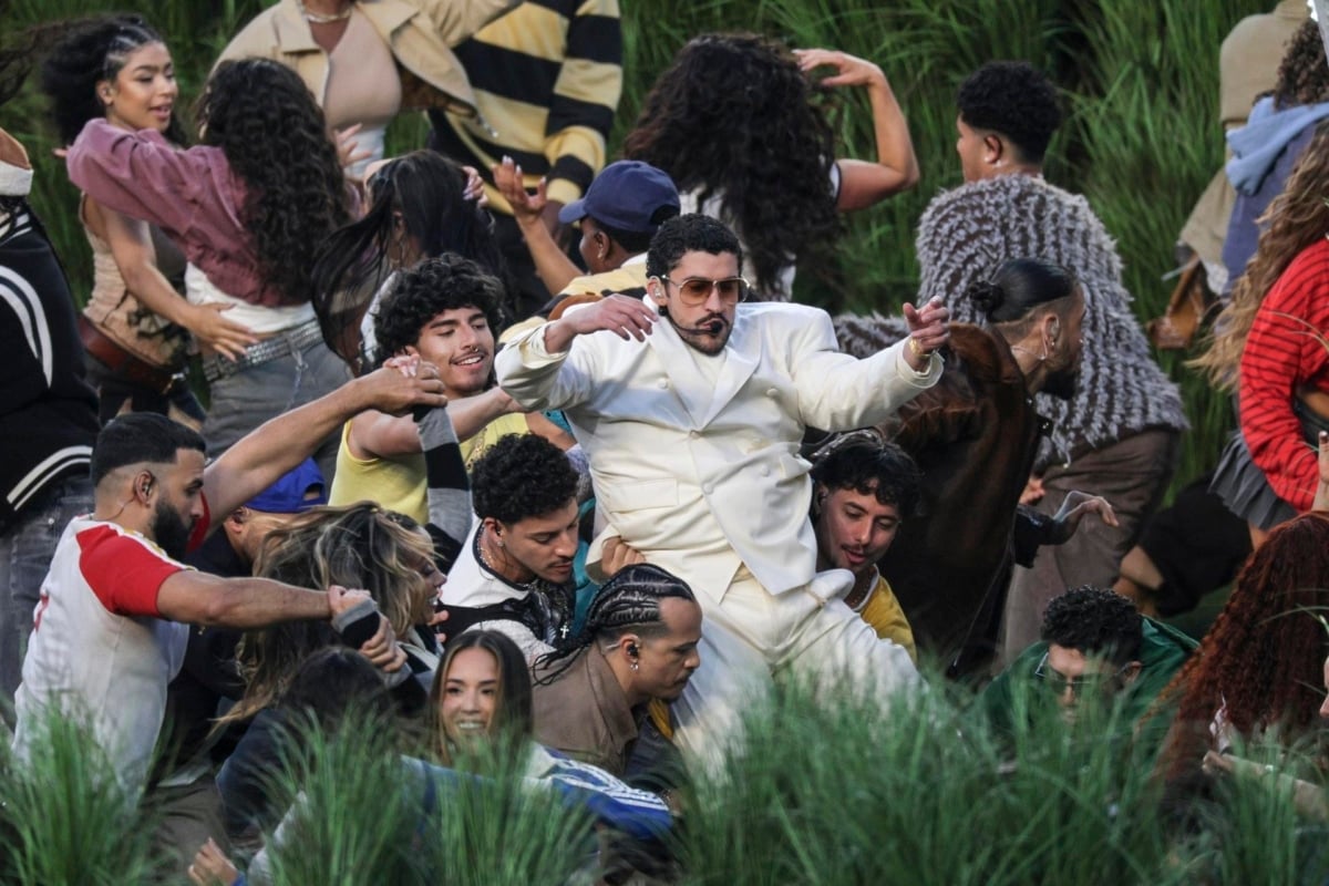 Bad Bunny ha protagonizado el descanso de la Super Bowl con una actuación íntegramente en español y una puesta en escena construida como un relato visual sobre Puerto Rico y la experiencia latina en Estados Unidos. El cantante abrió el espectáculo con Tití me preguntó, vestido de blanco por Zara y con un balón de fútbol americano bajo el brazo, y desplegó una escenografía que combinaba un cañaveral, escenas de barrio, campesinos, jugadores de dominó y la ya característica “casita”, integrada como eje del montaje. El repertorio avanzó entre Yo perreo sola, Mónaco y El apagón, alternando reguetón, salsa, plena y bomba, con referencias explícitas a la vida cotidiana en la isla.