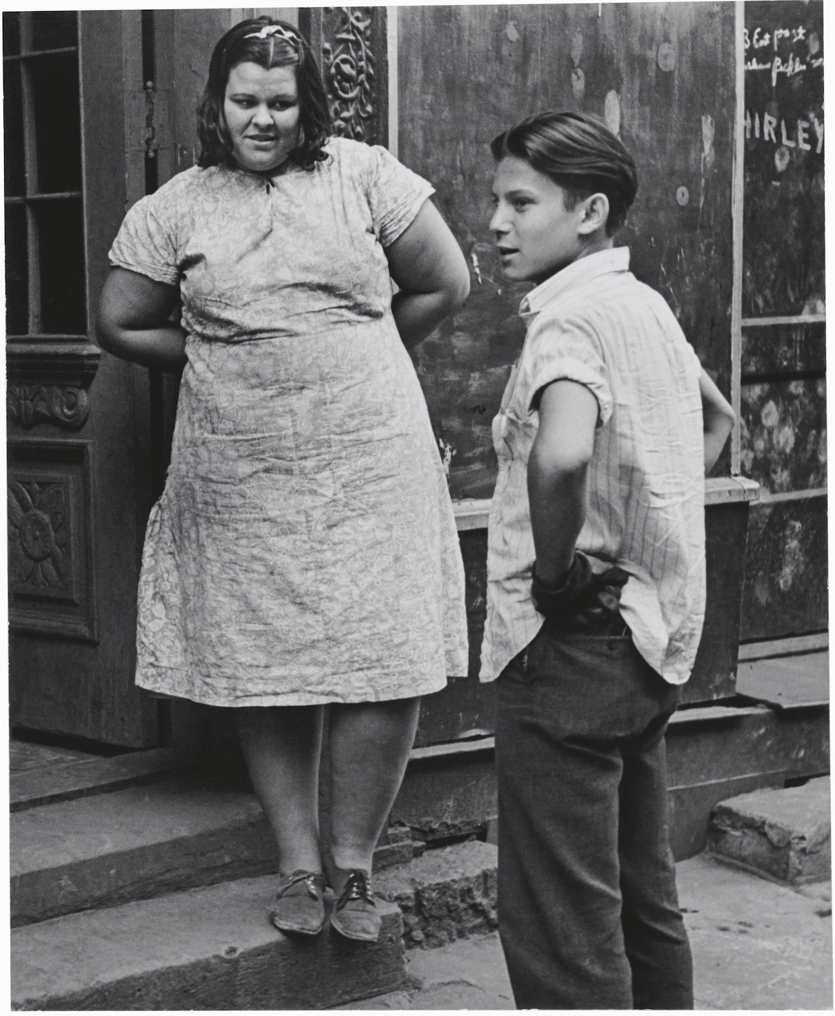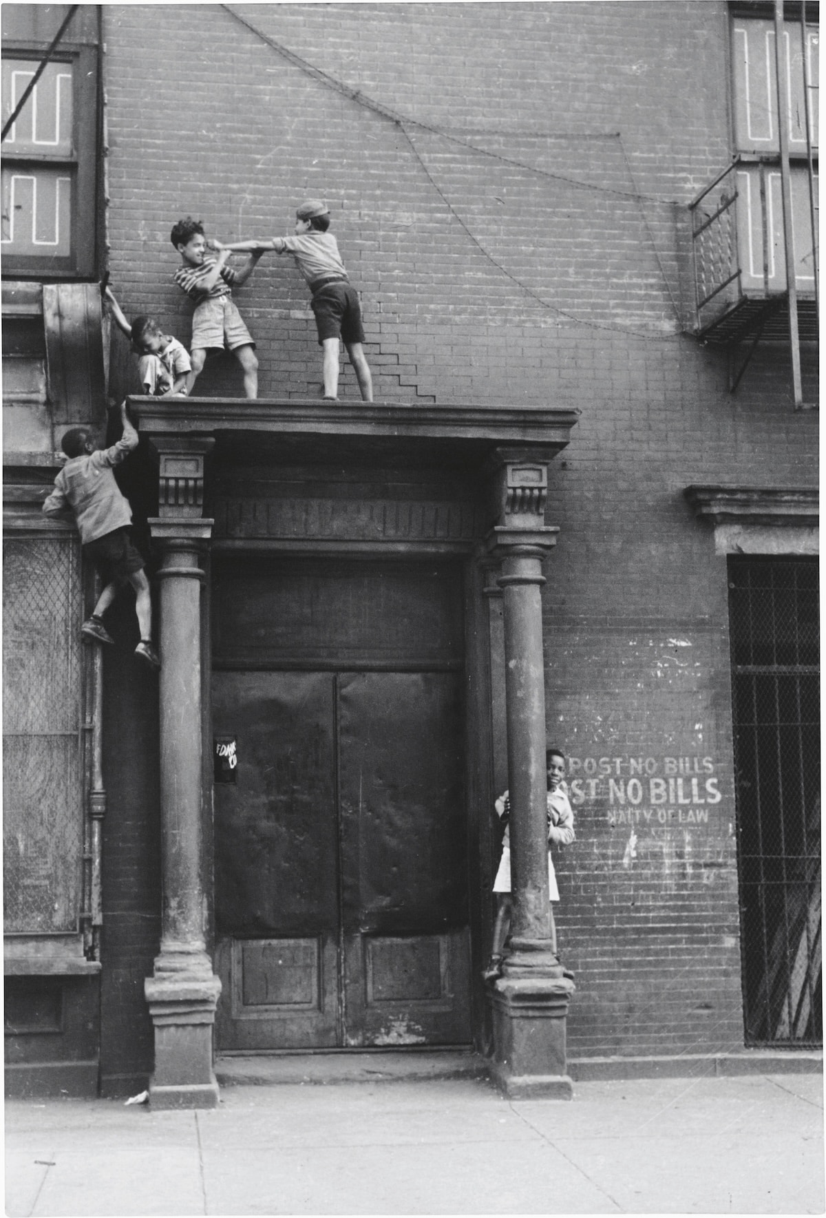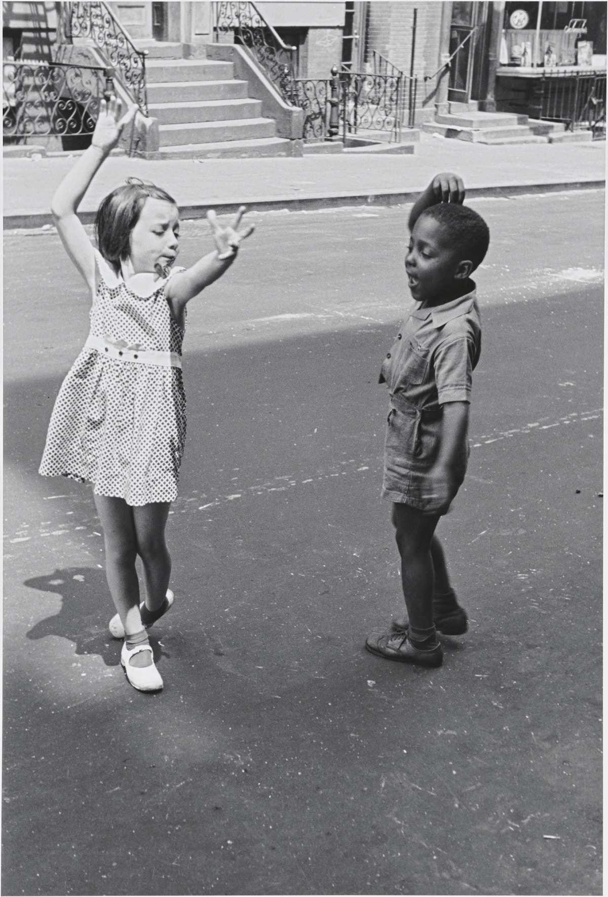 Hay una niña que baila sola en medio del asfalto, con los brazos abiertos, mientras un niño la observa sin decidir si imitarla o resistirse. Hay hombres apoyados en buzones, mujeres asomadas a ventanas, niños que dibujan con tiza en muros desconchados. Nada parece extraordinario y, sin embargo, todo lo es. Helen Levitt convirtió esa vibración mínima en materia fotográfica.
