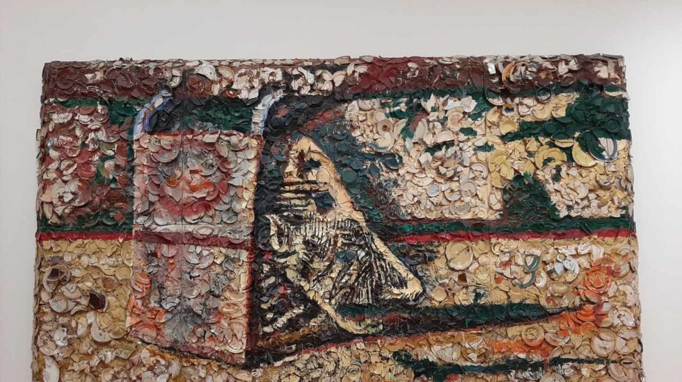 En otra de las piezas, ‘España’, de Julian Schnabel, los materiales empleados son platos y tazas rotas, bondo –resina de poliéster- y sobre los que pintaba al óleo. La idea estuvo inspirada en los mosaicos de Antonio Gaudí. Una obra de 3,3 metros de alto por casi 6 metros de ancho.