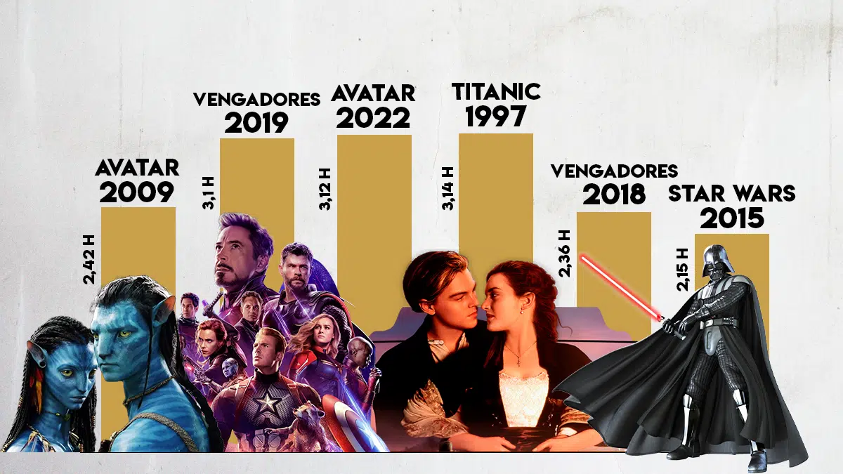 En el ranking de las películas más taquilleras de la historia, todas pasan de las dos horas y cuarto: Avatar (2009): 2h 42 mins con un presupuesto de 237 millones y una recaudación de 2.923.706.026, Vengadores (2019): 3h 1min con un presupuesto de 356 millones y una recaudación de 2.799.439.100, Avatar: El sentido del agua (2022): 3h 12 mins, con un presupuesto de 250 millones y una recaudación de 2.244.456.991, Titanic (1997): 3h 14 mins con un presupuesto de 200 millones y una recaudación de 2.243.134.099, Star wars: el despertar de la fuerza (2015): 2h 15mins, con un presupuesto de 306 millones y una recaudación de 2.071.310.218, Vengadores: Infinity war (2018): 2h 36mins, con un presupuesto de 316 millones y una recaudación de 2.052.415.039.