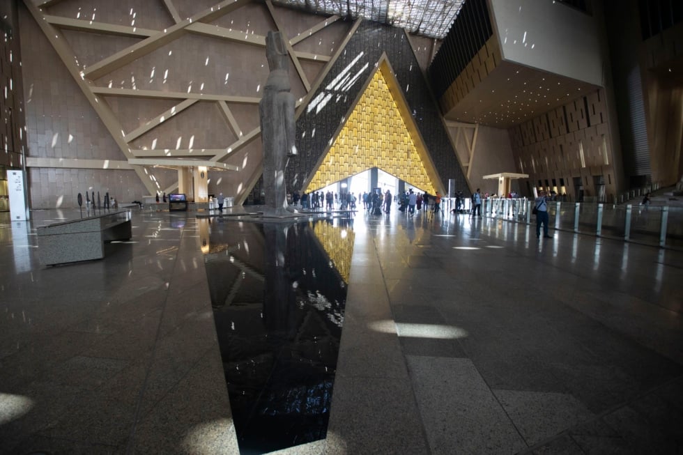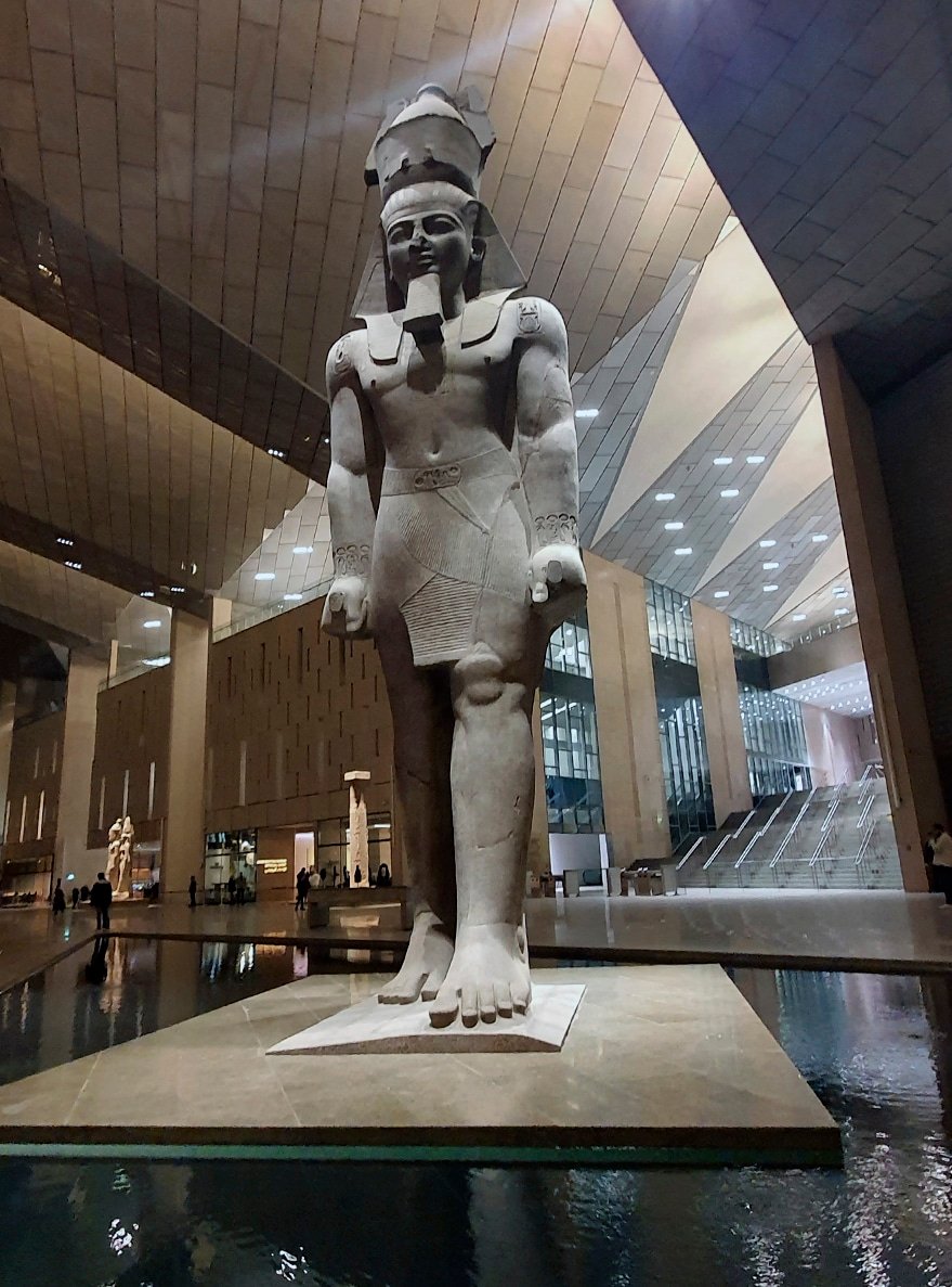 En su atrio de 7.000 metros cuadrados, un coloso de Ramsés II, de 83 toneladas y 3.200 años de antigüedad, recibe a los visitantes. Fue trasladado desde la rotonda frente a la estación central de El Cairo, donde durante décadas soportó el ruido y el humo de la capital. Desde allí parte una monumental escalera de seis pisos que conduce a las galerías principales, con vistas directas a las pirámides a través de ventanales de cristal.