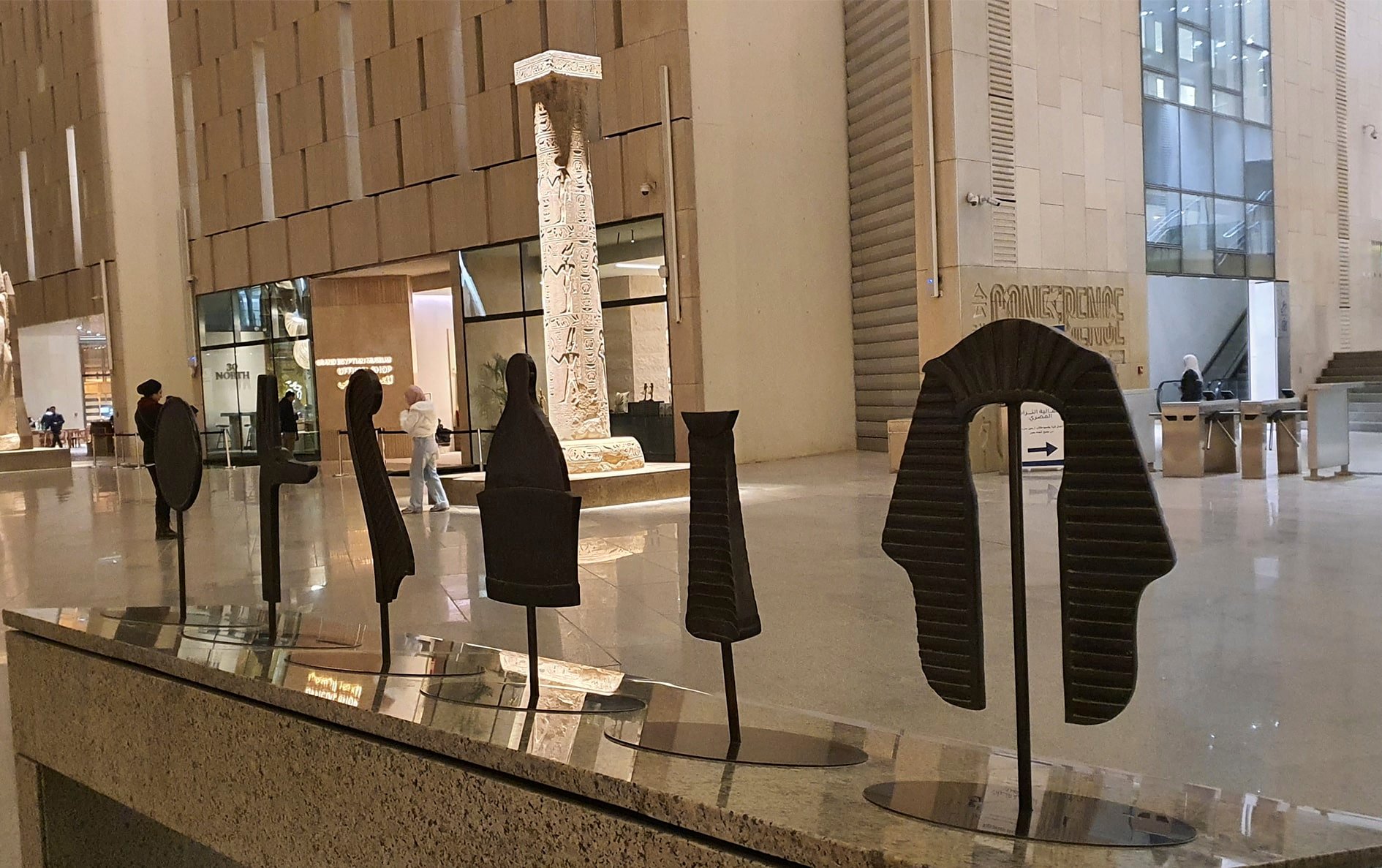 El GEM alberga más de 50.000 artefactos, distribuidos en 24.000 metros cuadrados de exposición permanente y 12 grandes galerías que recorren la historia desde la prehistoria hasta el Egipto romano. Muchas piezas proceden del antiguo Museo de la plaza Tahrir; otras, de excavaciones recientes en Saqqara, el vasto cementerio de pirámides al sur de la capital, o de los cientos de yacimientos repartidos por todo el país.