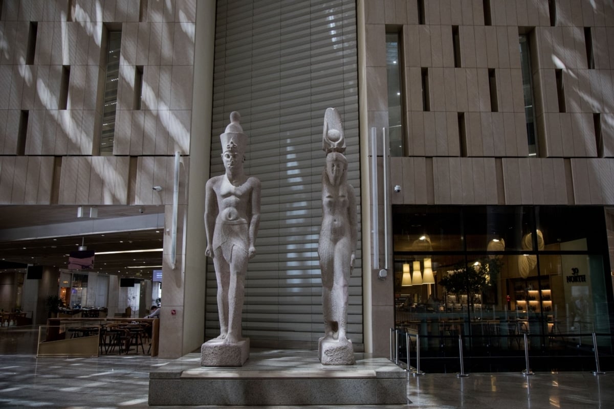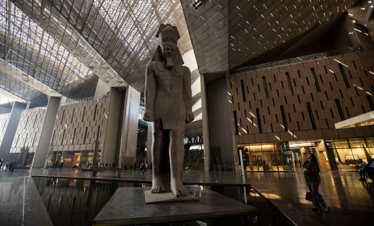 En su atrio de 7.000 metros cuadrados, un coloso de Ramsés II, de 83 toneladas y 3.200 años de antigüedad, recibe a los visitantes. Fue trasladado desde la rotonda frente a la estación central de El Cairo, donde durante décadas soportó el ruido y el humo de la capital. Desde allí parte una monumental escalera de seis pisos que conduce a las galerías principales, con vistas directas a las pirámides a través de ventanales de cristal.