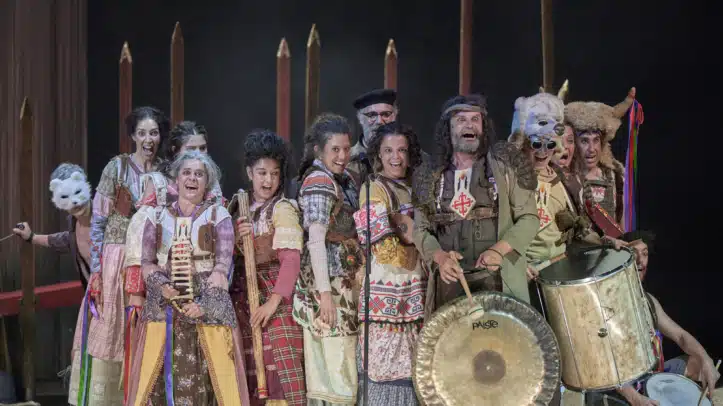 Fuenteovejuna lo hizo, Rakel Camacho ve las lágrimas de sangre, los moratones en el cuerpo, nada de romanticismo en su propuesta. Hay dolor, hay violencia, hay llamarada de lucha, hartura, desesperación, no se puede aguantar más. Quiere hacer atemporal la historia, utiliza símbolos de diferentes épocas y civilizaciones, tanto pasadas como actuales, hoy no tiene sentido una ballesta, las cruces de Calatrava son escapularios, los atuendos podrían ser kimonos, deportivas actuales, y un aire a fiesta popular y folclórica, a campo, en la comprensión de cada uno de los vecinos y vecinas del lugar, sentirse apoyados por ellos, y no pasar a la acción, por miedo a las represalias, hasta el alegato de Laurencia donde les abre los ojos y los remueve porque ya no se puede estar con los brazos cruzados.